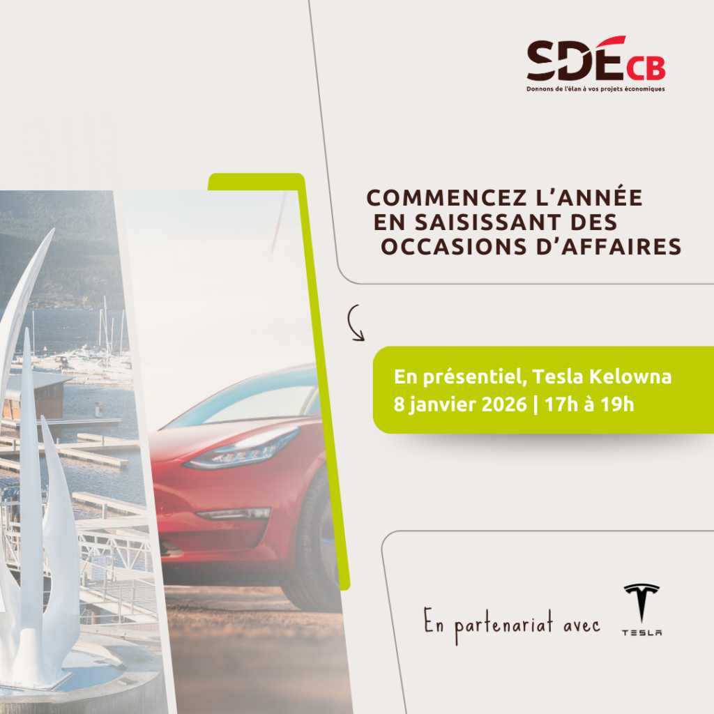 La SDÉCB en collaboration avec le concessionnaire Tesla, vous invitent à participer à un 5 à 7 exclusif dans les nouveaux locaux de Tesla pour réseauter, partager différents types d’expertises, développer de nouveaux partenariats et saisir des opportunités d’affaires.