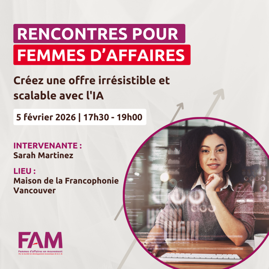 Le groupe Femmes d'Affaires en Mouvement (FAM), fondé par la SDECB en 2002, est une communauté dynamique qui s'adresse aux femmes entrepreneures francophones et bilingues de la Colombie-Britannique. Son objectif est d'accompagner les entrepreneures dans la réalisation de leurs ambitions et de les soutenir face aux défis courants tels que l'accès au financement, aux marchés, la discrimination, ou encore l'équilibre entre vie professionnelle et vie privée.