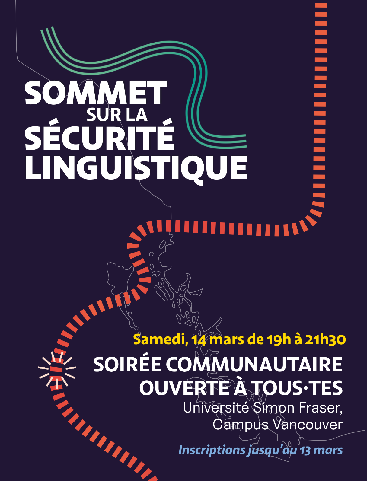 Le Conseil jeunesse francophone de la Colombie-Britannique (CJFCB) est heureux de vous inviter à la soirée communautaire clôturant le Sommet sur la sécurité linguistique.