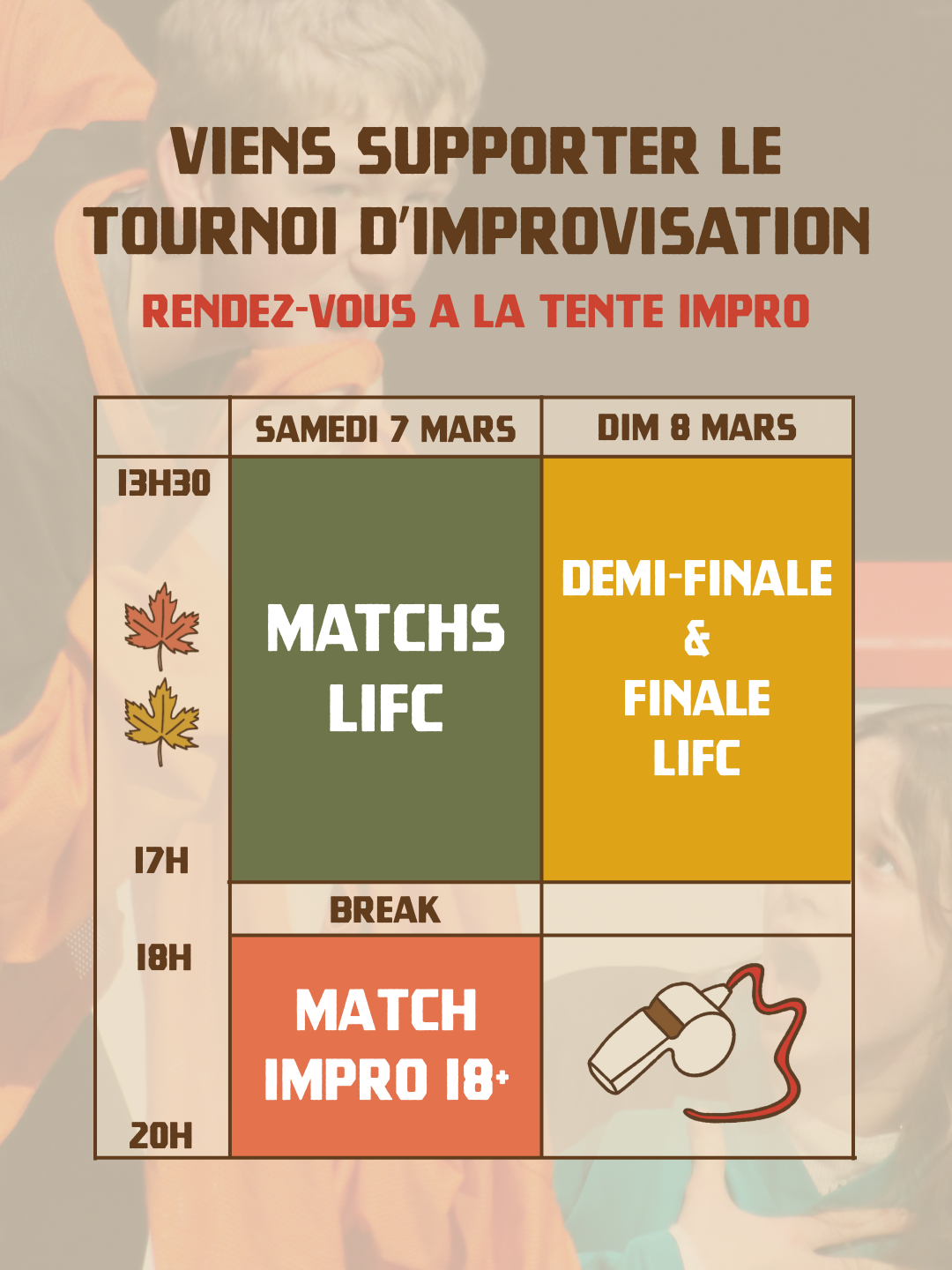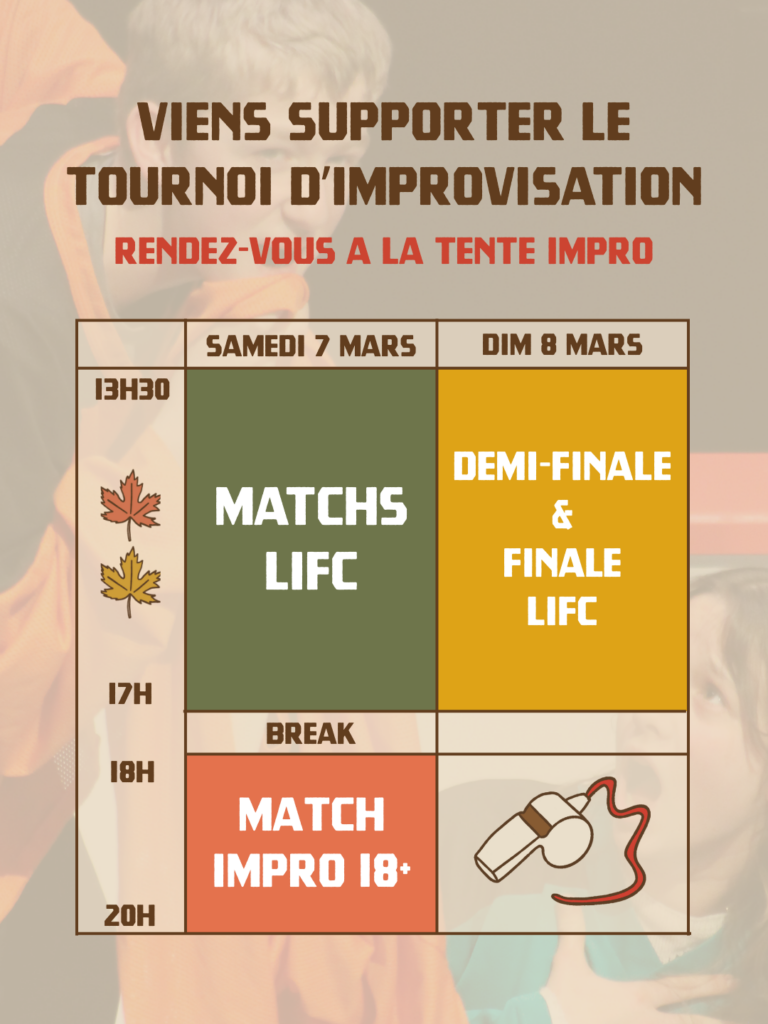 Rendez-vous le 6 et 7 mars à la Tente Impro / Théâtre Sports, où l’impro 18+ se produira également samedi en soirée !